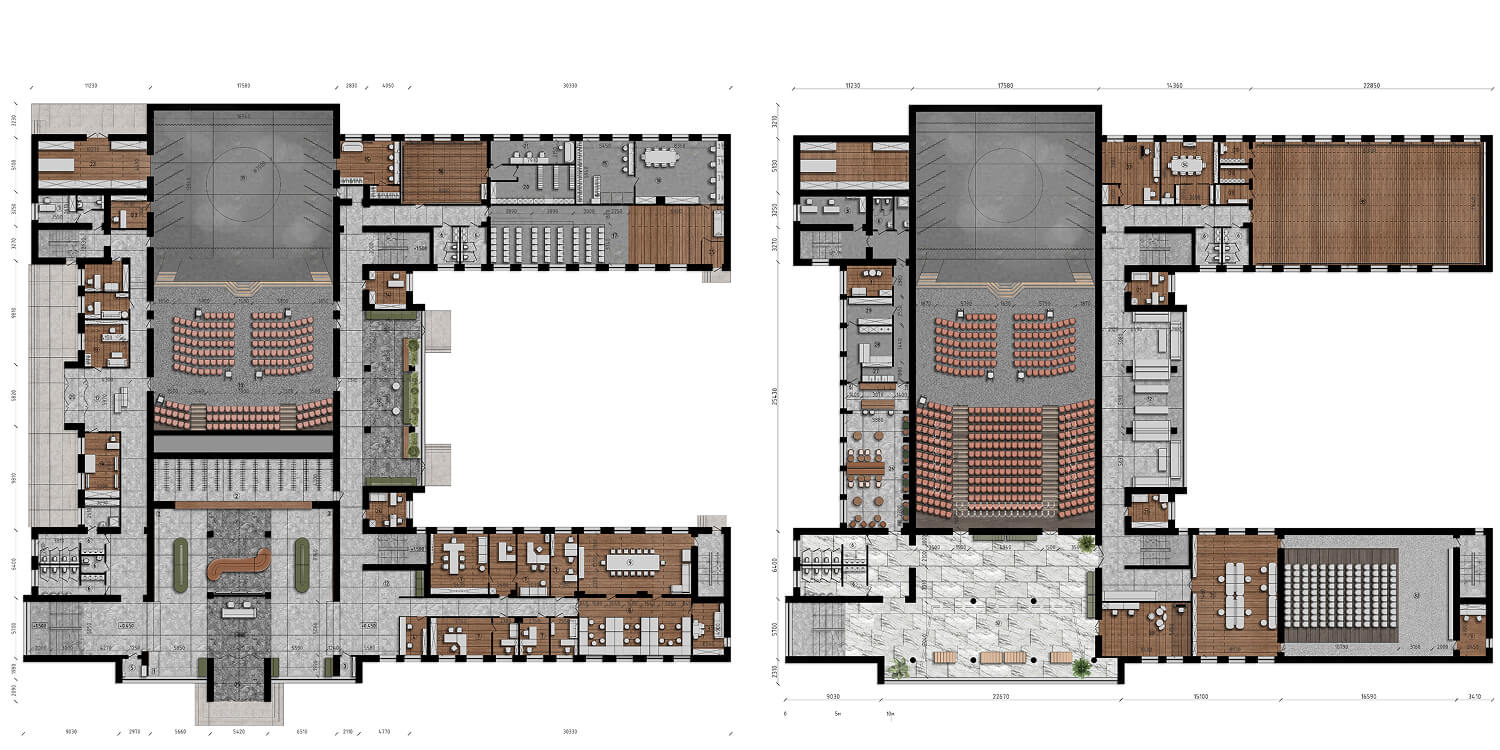 На втором этаже расположено фойе с мраморной отделкой и деревянными порталами, задающими торжественное настроение. Модульная мебель позволяет адаптировать пространство под мероприятия, а дизайнерский потолок делает его узнаваемым и выразительным. Все зоны объединены общей идеей: наполнить пространство смыслом, создать комфортную и вдохновляющую среду, где архитектура становится частью культурного опыта.