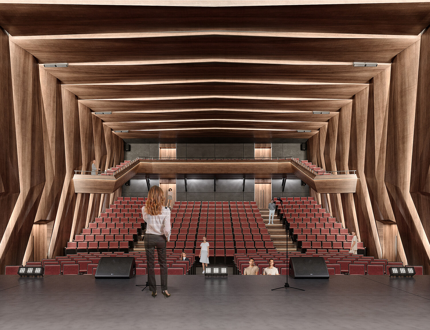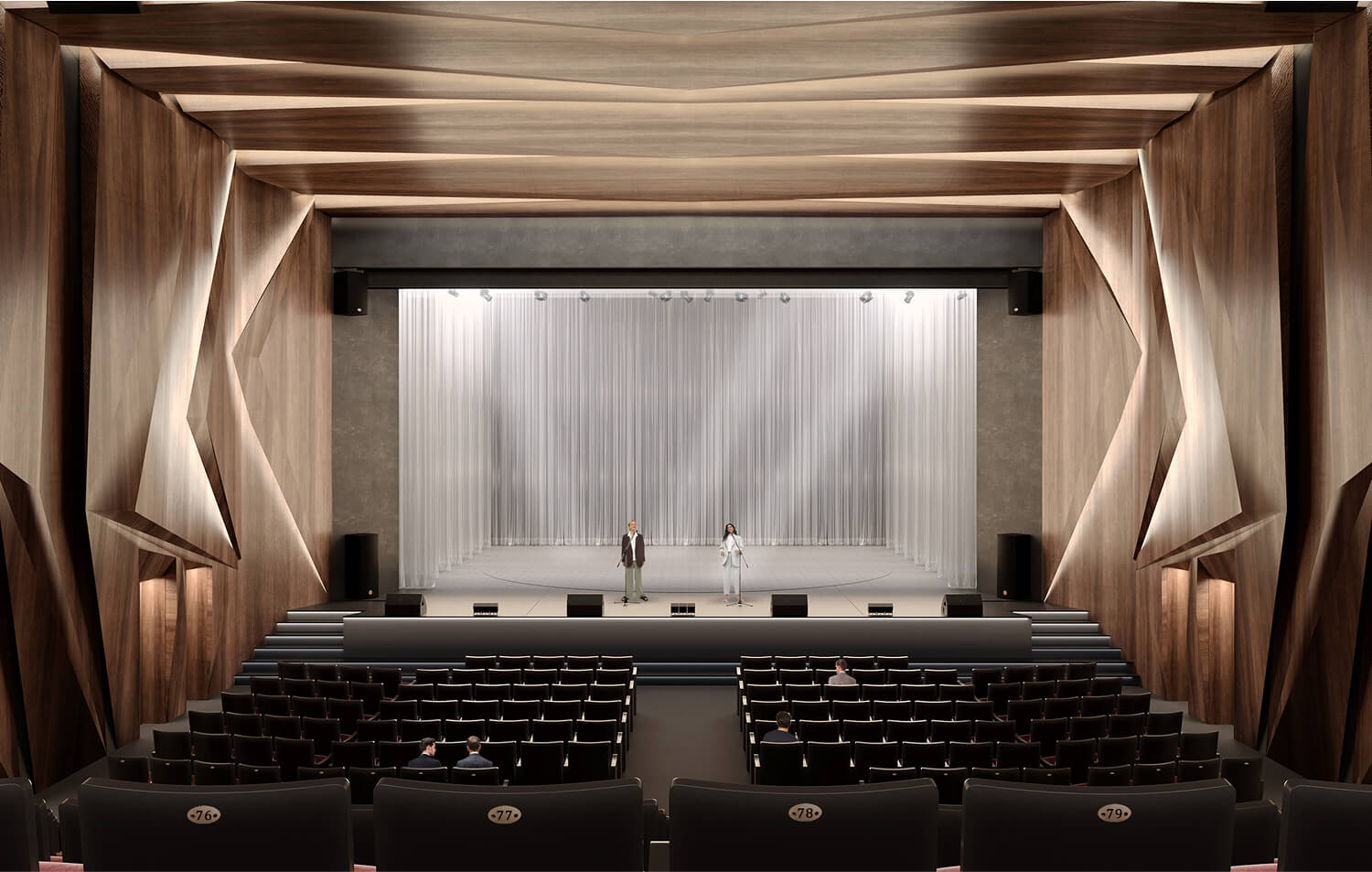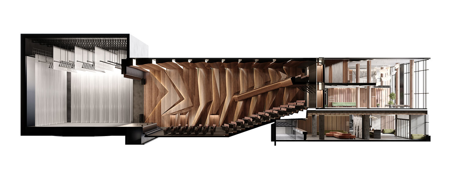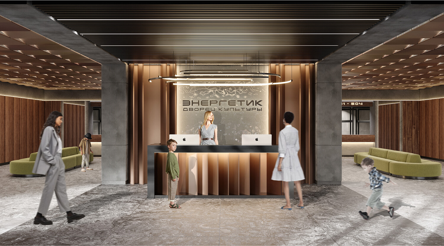 В интерьере Дворца культуры мы отразили природные и архитектурные символы города Дивногорска. Вестибюль встречает стойкой ресепшен, образ которой вдохновлён Дивногорской ГЭС: вертикальные элементы напоминают платину, оргстекло — сброс воды, а арт-светильник символизирует энергию. Лесная тема продолжается в фойе — здесь много живой зелени, мягкий свет и выставка исторических фотографий, формирующих эмоциональную связь с городом. Концертный зал отсылает к образу горной местности: деревянные акустические панели формируют рельеф, а подсветка имитирует солнечные лучи, пробивающиеся сквозь массив.