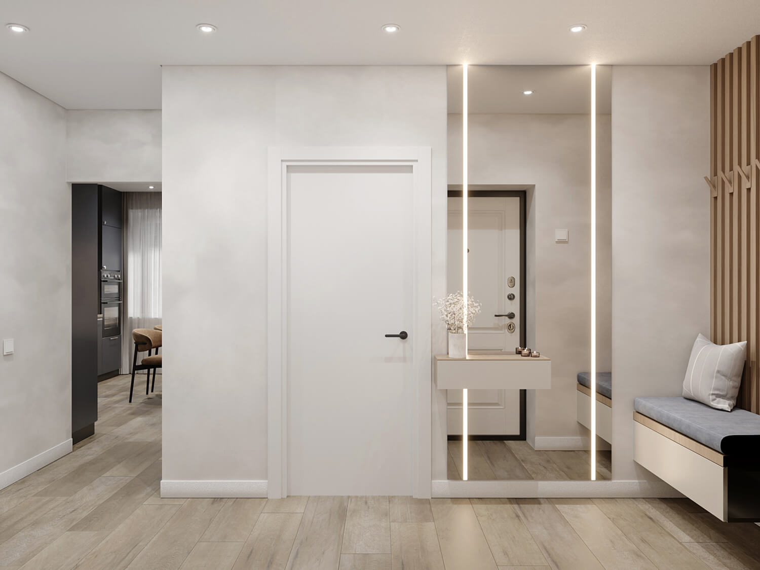 Квартира решена в светлых оттенках с тёплыми акцентами и текстильными элементами, добавляющими уюта. Лаконичные формы и функциональные решения делают интерьер понятным и удобным в использовании. Зонирование выполнено с учётом сценариев повседневной жизни арендаторов — здесь легко отдыхать, готовить, работать и просто чувствовать себя как дома.