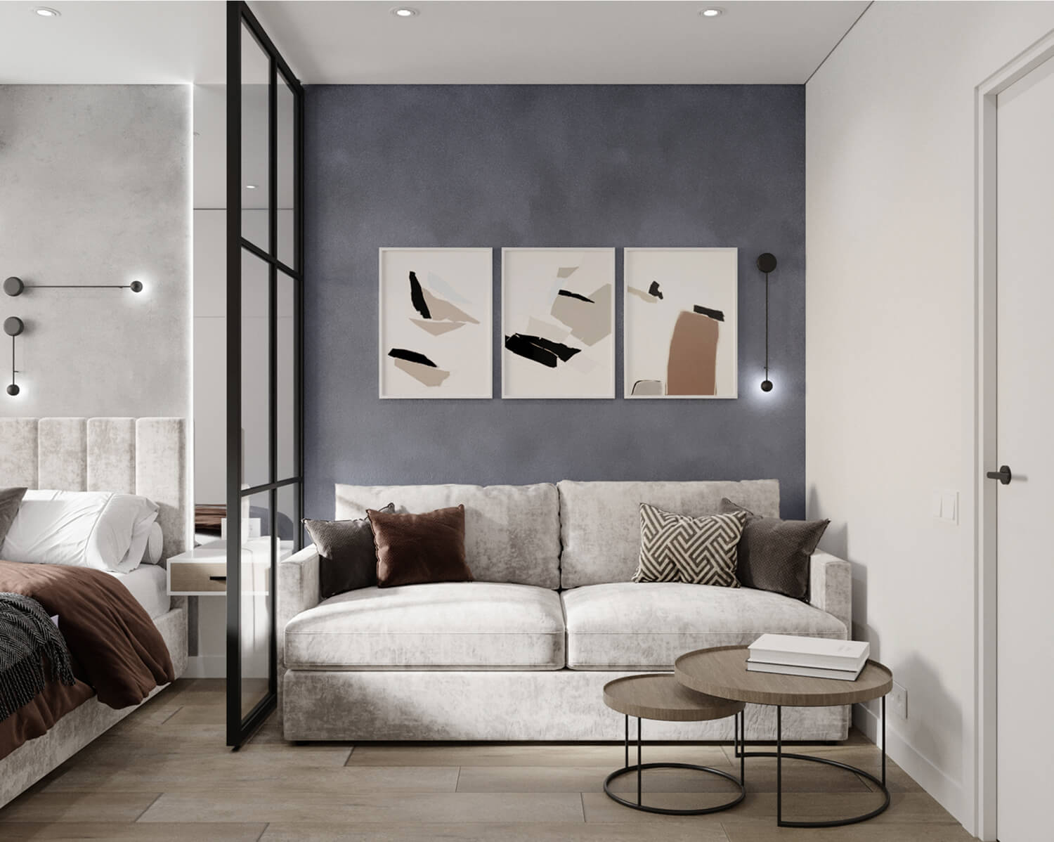 Квартира выполнена в формате студии, поэтому важно было чётко разграничить зоны для отдыха и сна. С помощью мебели и освещения мы выделили спальную и обеденную часть, не перегружая пространство. Всё построено на принципах комфорта и визуального баланса.