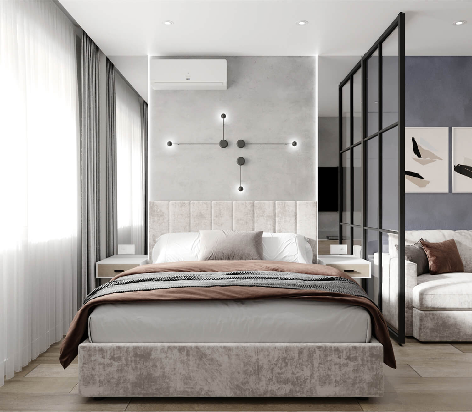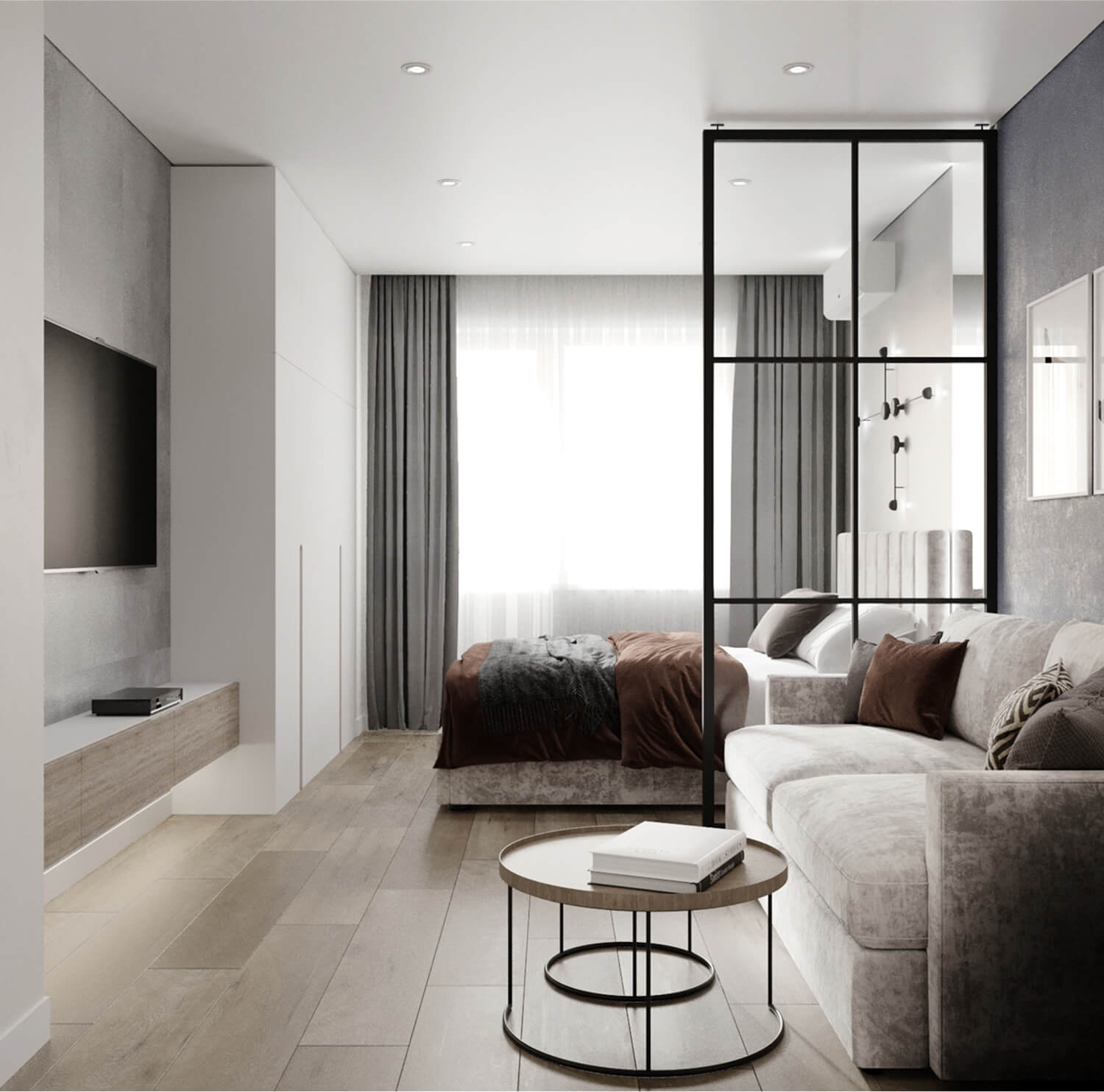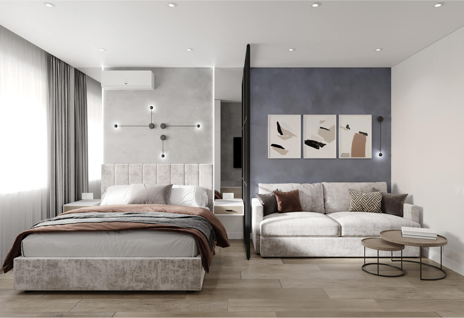 Функциональное зонирование спальной и гостиной зоны