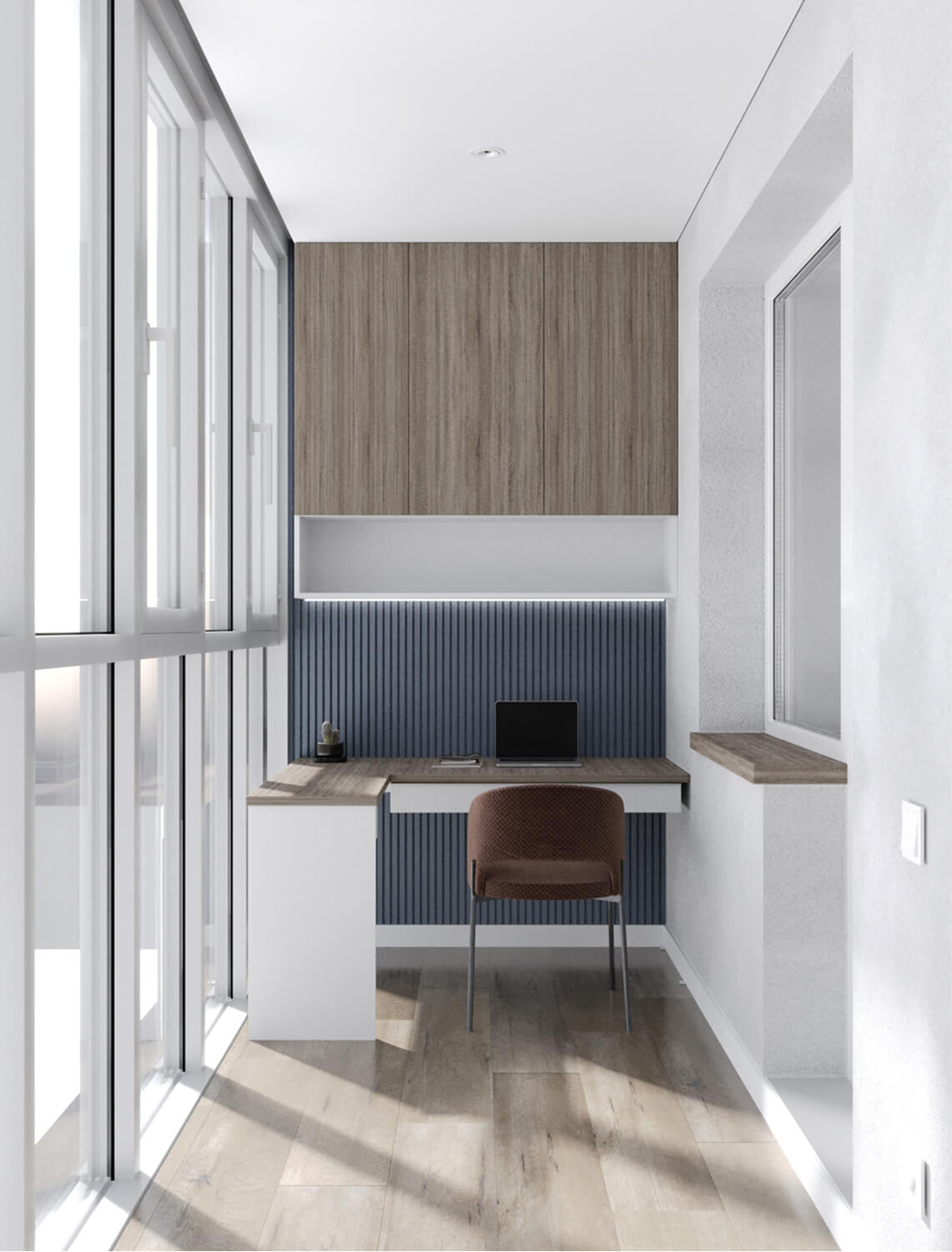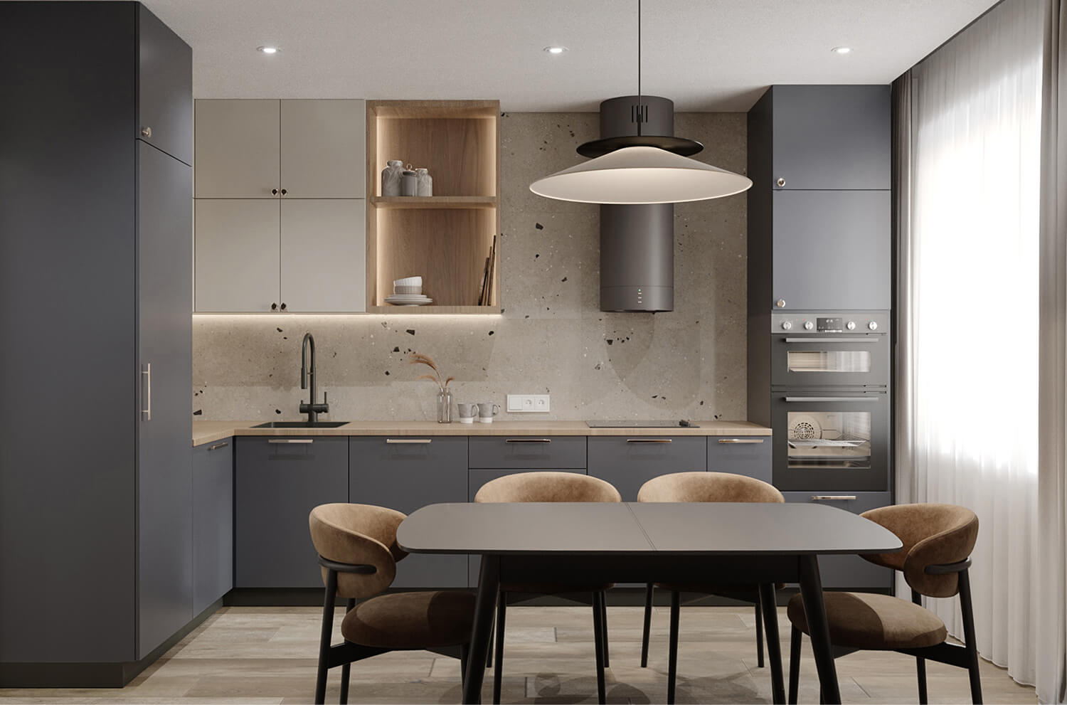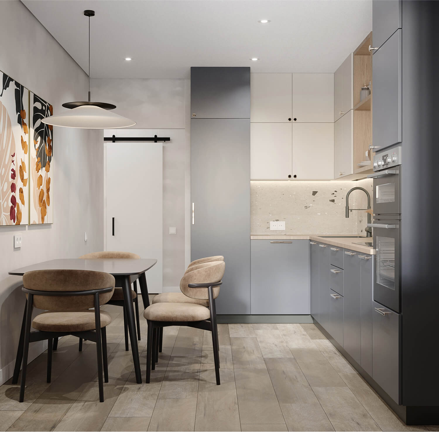 Проект реализован в рамках ограниченного бюджета, поэтому особое внимание уделено подбору доступных, но эстетичных материалов и решений. Мы использовали качественные, долговечные покрытия и серийную мебель, не в ущерб стилю и восприятию пространства.