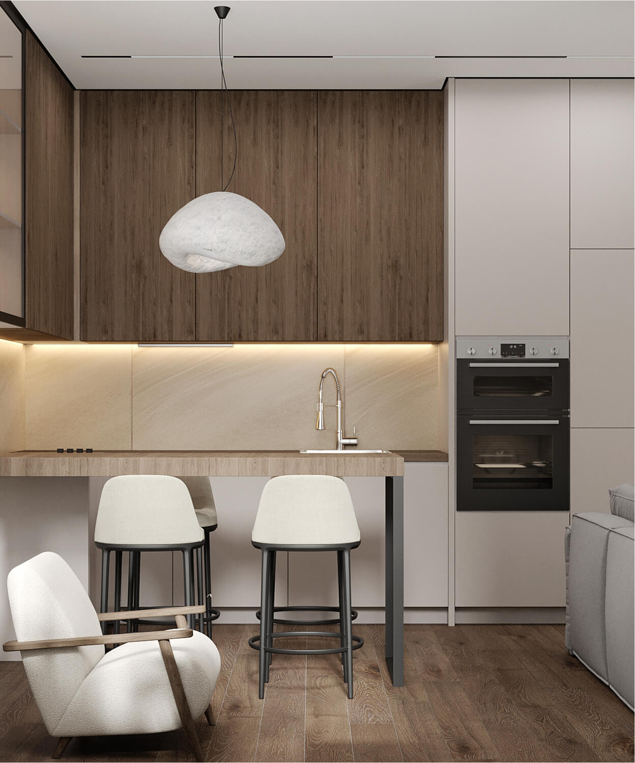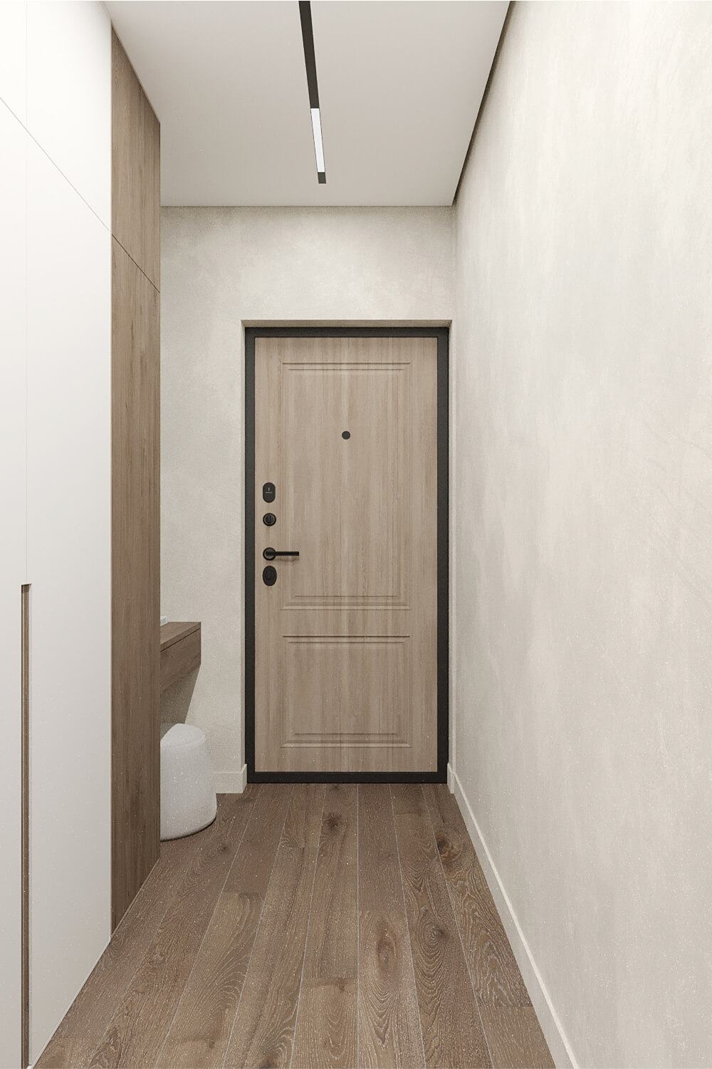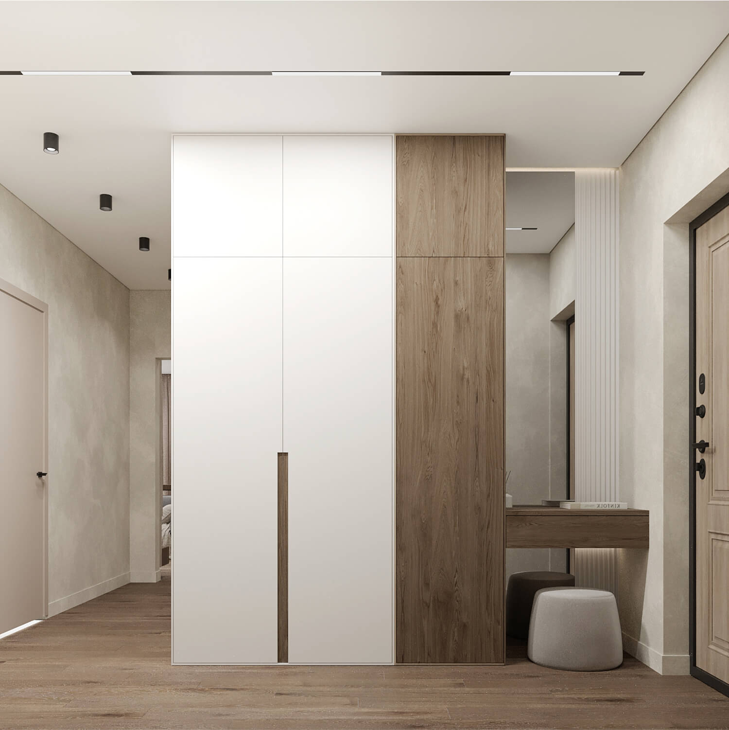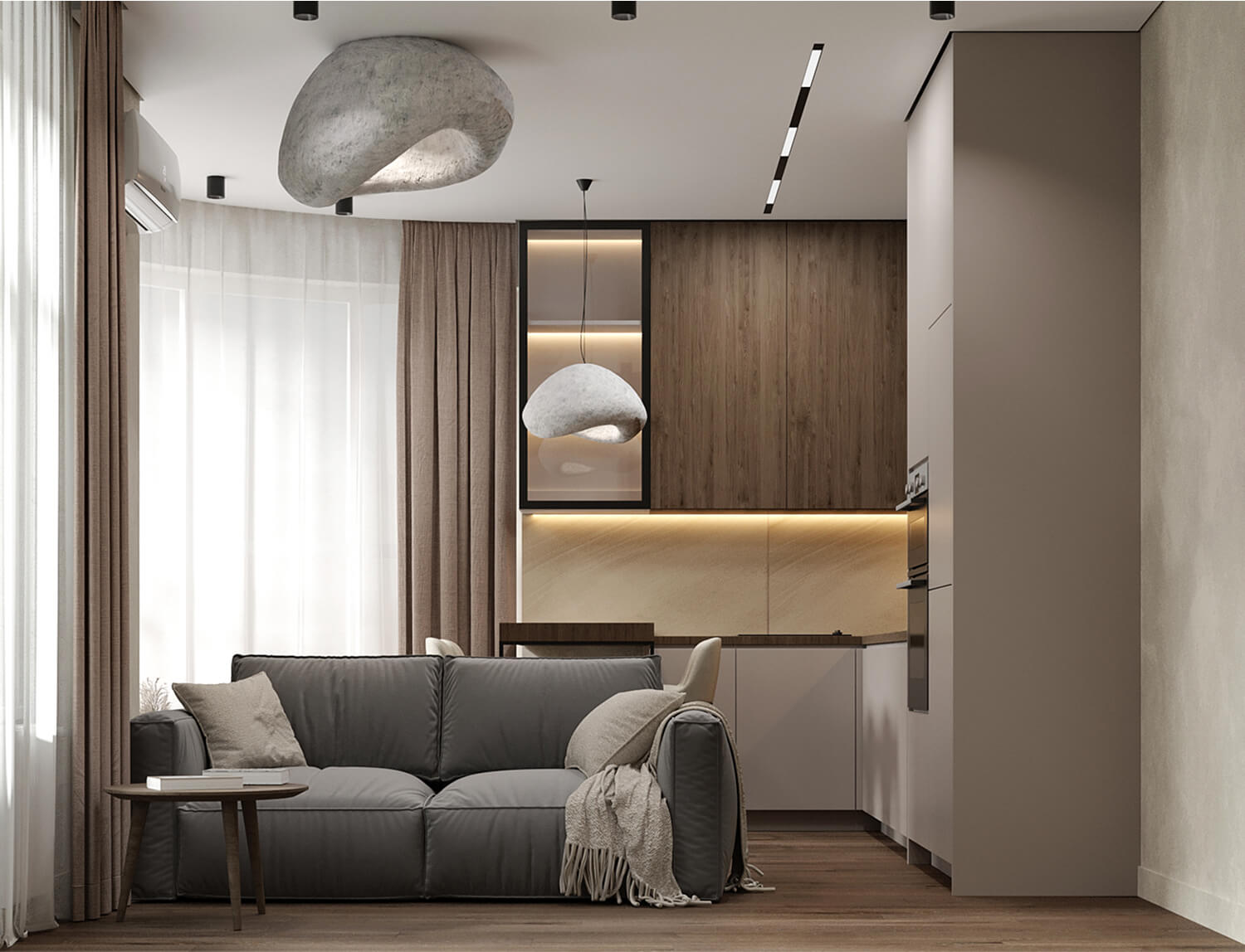 — это актуальное, светлое пространство, в котором сочетаются минимализм, функциональность и тонкая эстетика. Интерьер получился сдержанным, но выразительным — с характером, ритмом и вниманием к материалам, формам и деталям, создающим атмосферу лёгкости и уюта.
