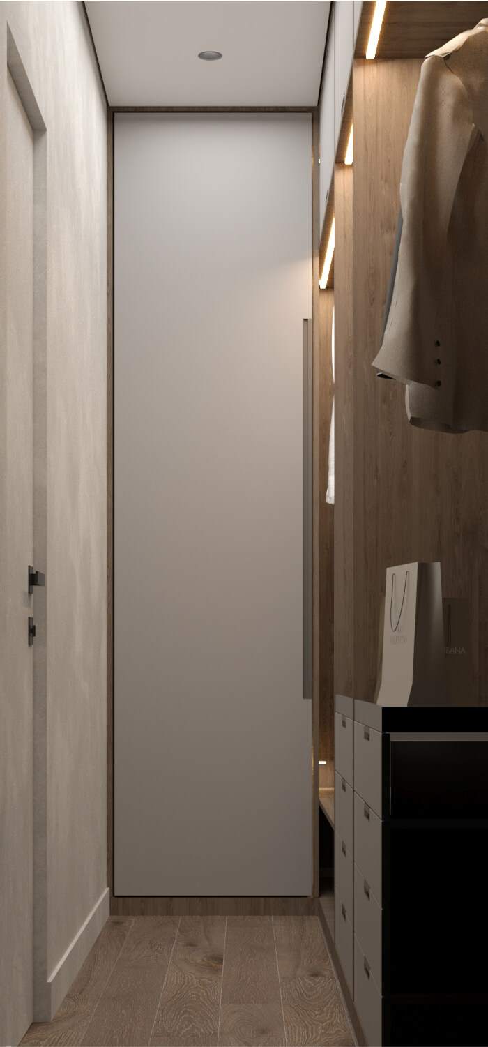 В спальне предусмотрена полноценная гардеробная, органично встроенная в общее пространство. Мы сохранили единый стиль, использовав светлые фасады и встроенные решения, чтобы зона хранения не выбивалась из общей композиции. Благодаря правильному зонированию спальня остаётся лёгкой, но при этом полностью функциональной.