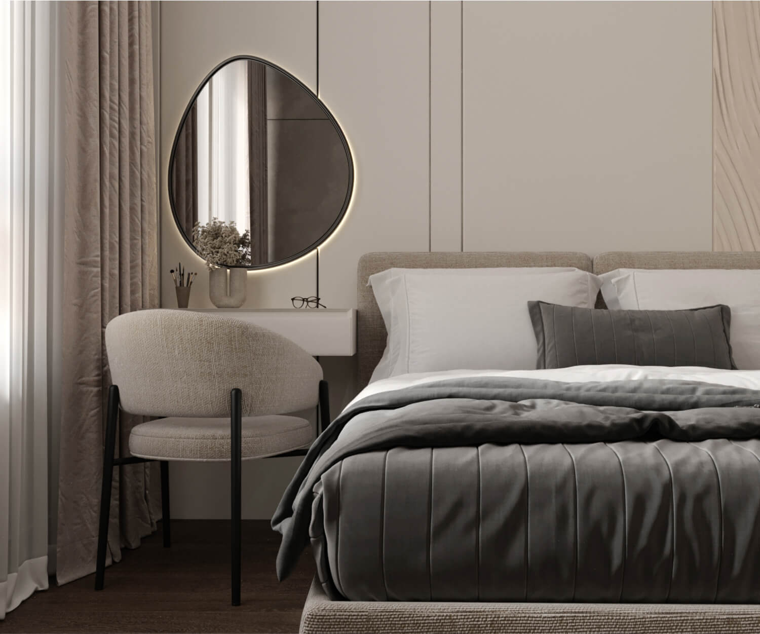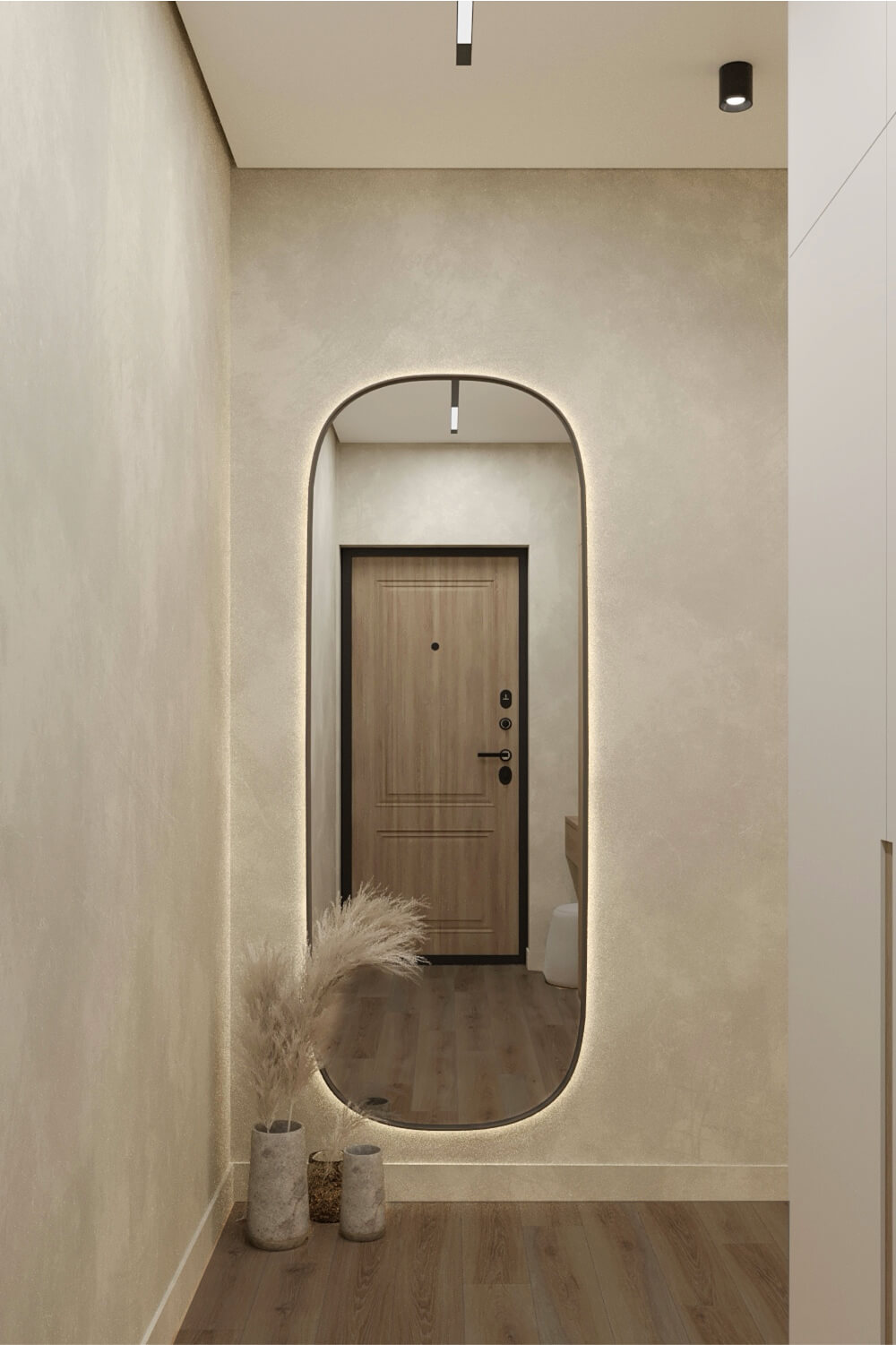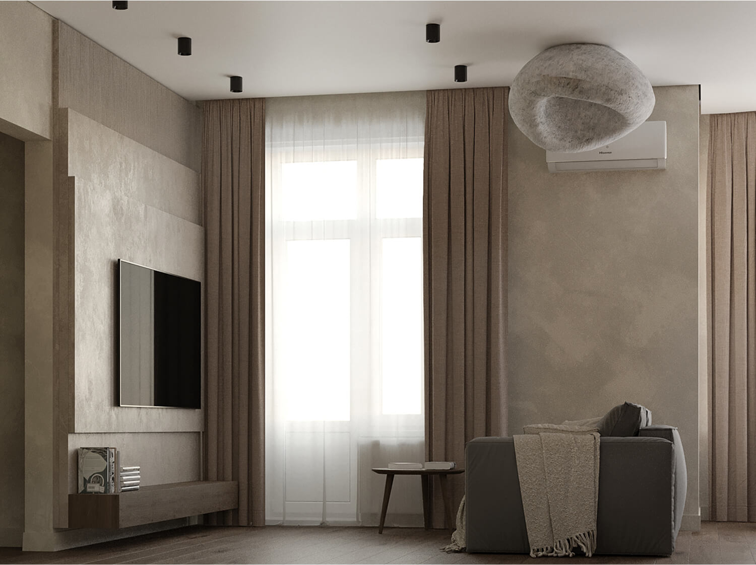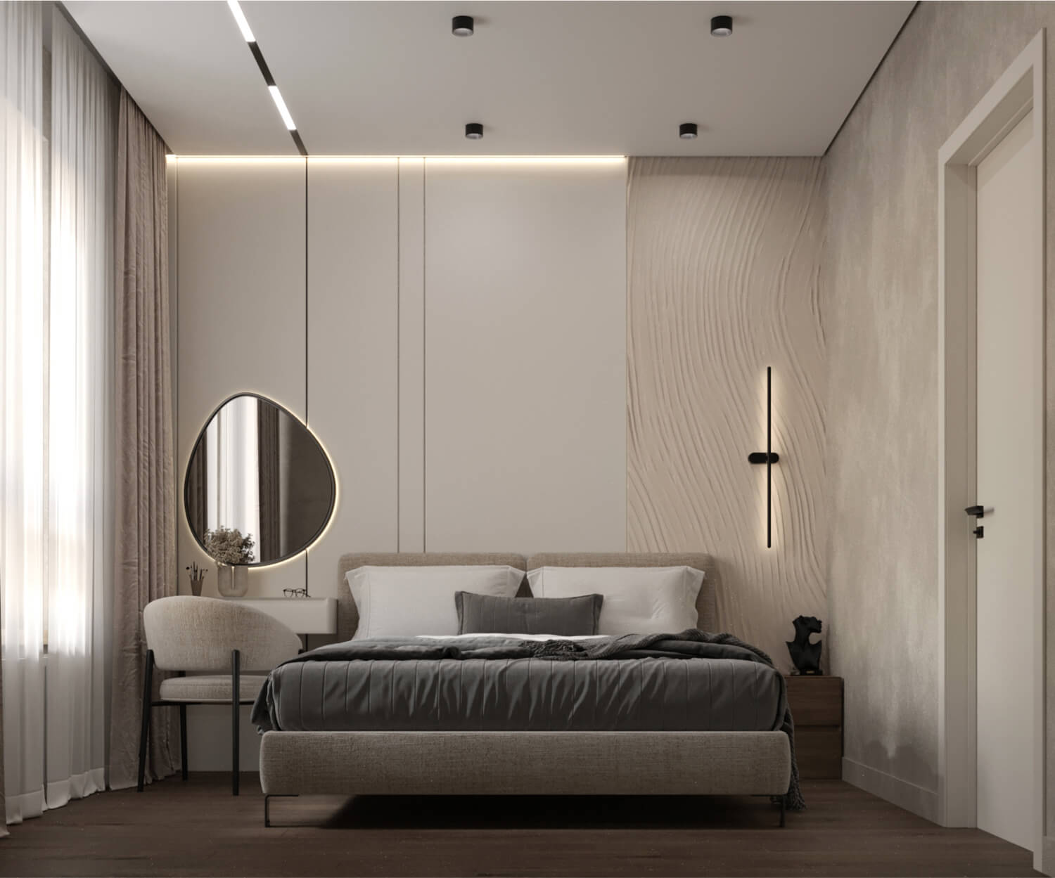Основной задачей было сохранить максимум открытого пространства и визуальной легкости. Мы работали с базовыми светлыми оттенками и натуральными текстурами, что позволило добиться чистоты восприятия и уюта. Дизайн построен на тонких деталях: простая геометрия, рельефные поверхности и сложные по форме декоративные элементы формируют атмосферу лёгкости и современности.